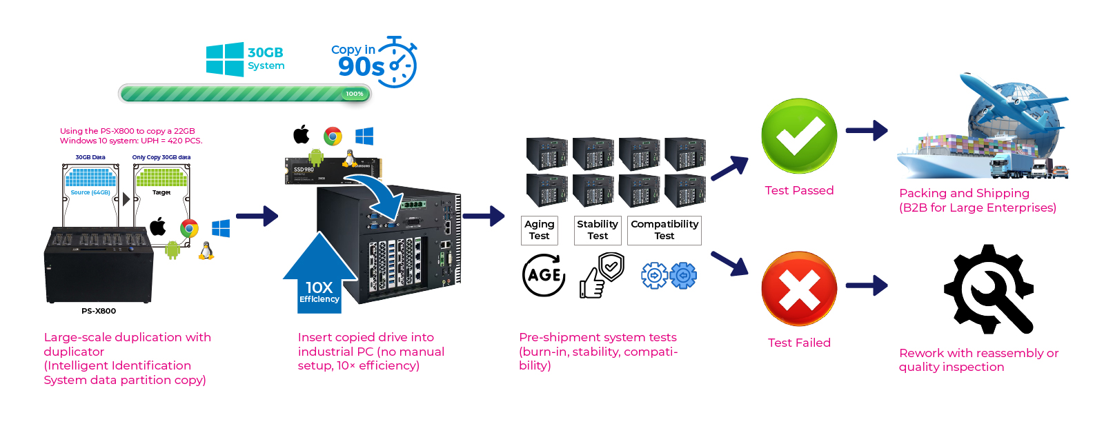 Industrial computer OEM manufacturers use UReach hard drive duplicators to batch copy both testing systems and shipping systems. After duplication, the drives are installed into industrial computers for pre-shipment system testing. Units that pass testing can be packed and shipped directly, while those that fail require rework and retesting before shipment. Using duplicators to copy system drives helps factories significantly improve efficiency and greatly reduce labor costs.
